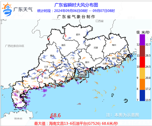 海上大风预报:7日,北部湾海面风力10~12级、阵风14~15级,台风中心经过的海面旋转风14~16级;南海西北部海面、琼州海峡和粤西海面风力7~8级、阵风9~10级,下午减弱至6~7级、阵风8级,夜