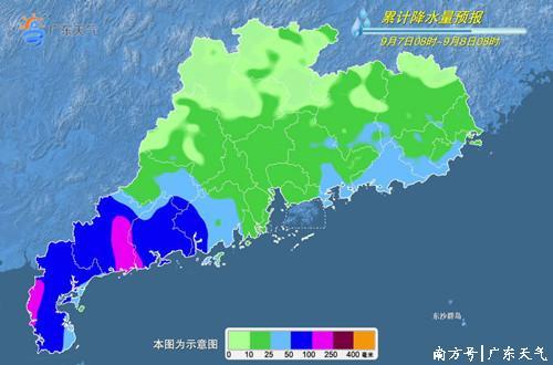 7日白天粤西市县仍有明显风雨,夜间明显减弱。具体预报:7日白天,粤西市县仍有暴雨,局部大暴雨,沿海伴有7~10级大风,珠江三角洲市县有中雨局部暴雨,其余市县阵雨局部大雨;7日夜间起,风雨明显减弱。