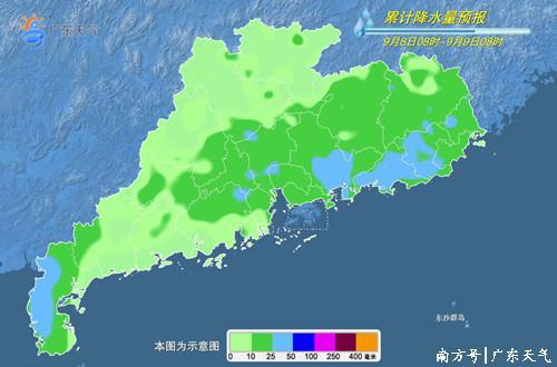 9-10日,广东大部多云为主,有分散性(雷)阵雨。