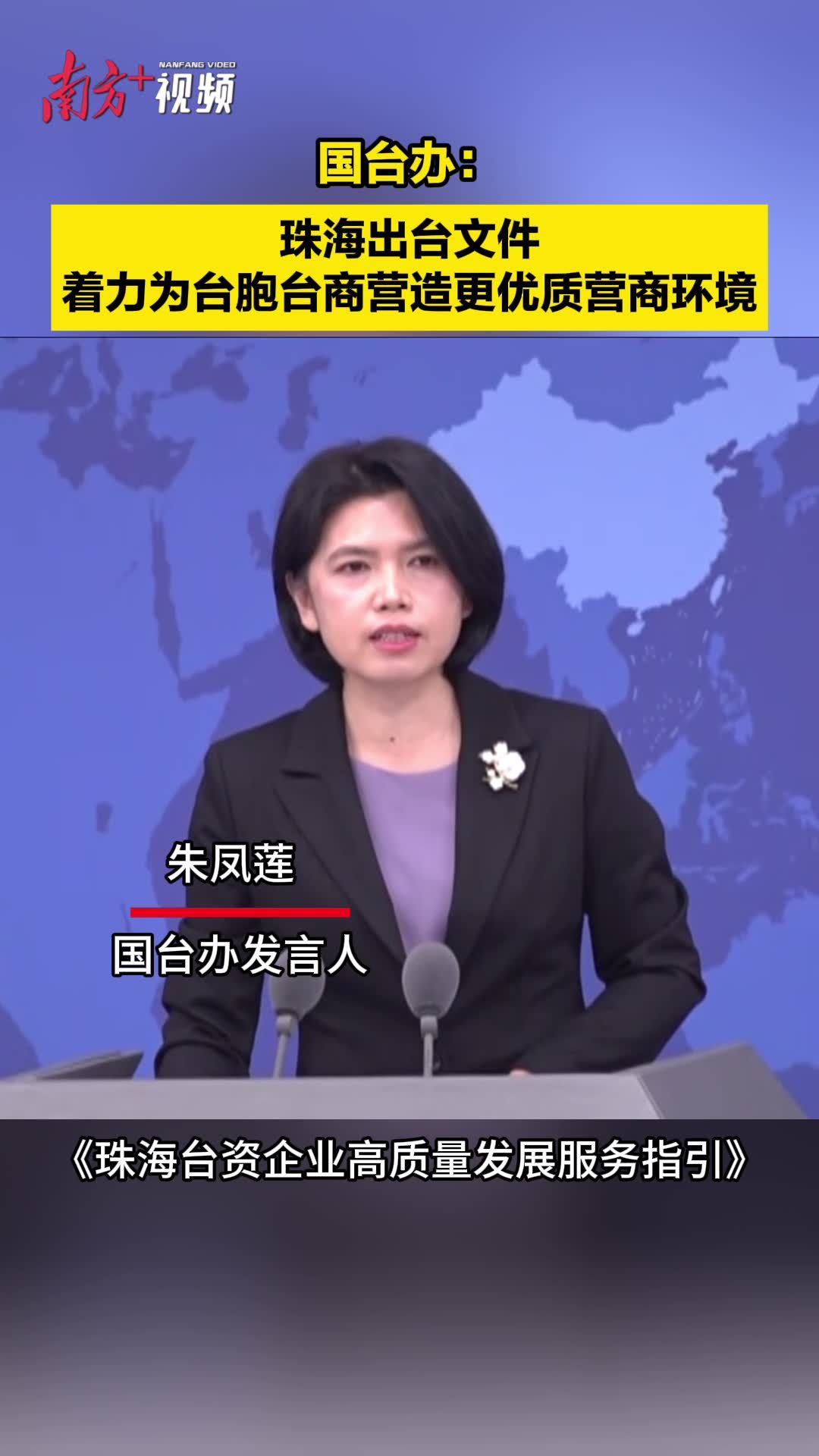 11月28日,广东省珠海市发布《珠海台资企业高质量发展服务指引》(以下简称《服务指引》)。在今天举行的国台办例行新闻发布会上,朱凤莲介绍,《服务指引》的出台,是各地创新服务举措、完善落实惠及台胞台企政策措施的有益尝试,着力为台胞台商营造更优质营商环境,帮助台商台企融入新发展格局、实现高质量发展。