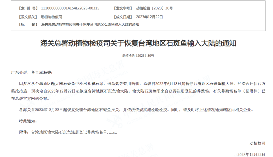 各海关自2023年12月22日起恢复受理台湾地区石斑鱼报关,并依法依规实施检验检疫。同时,请及时将上述情况通知辖区内相关企业。