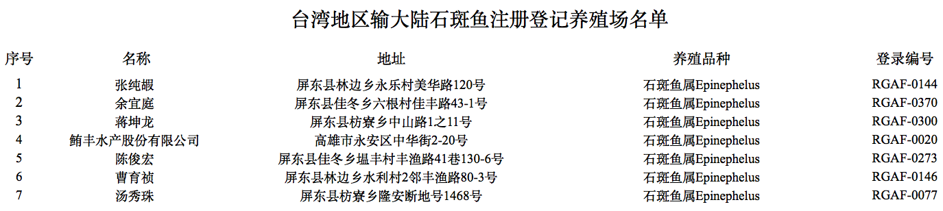 因多次从台湾地区输大陆石斑鱼中检出孔雀石绿、结晶紫等禁用药物,总署自2022年6月13日起暂停台湾地区石斑鱼输大陆。经综合评估台方整改措施,现决定自2023年12月22日起恢复台湾地区石斑鱼输大陆。输大陆石斑鱼须来自获得注册登记的养殖场,有关养殖场名单已在总署官方网站公布。