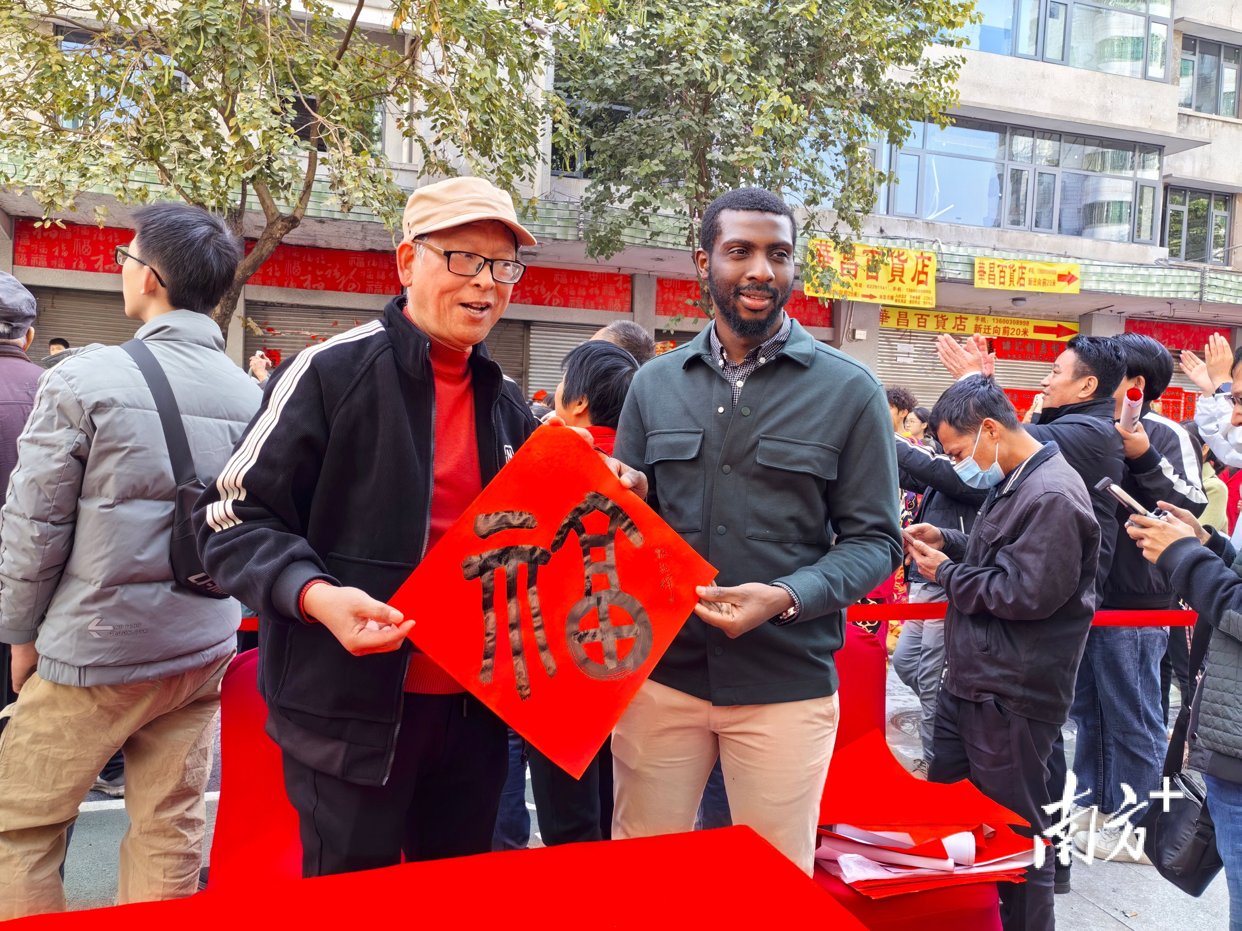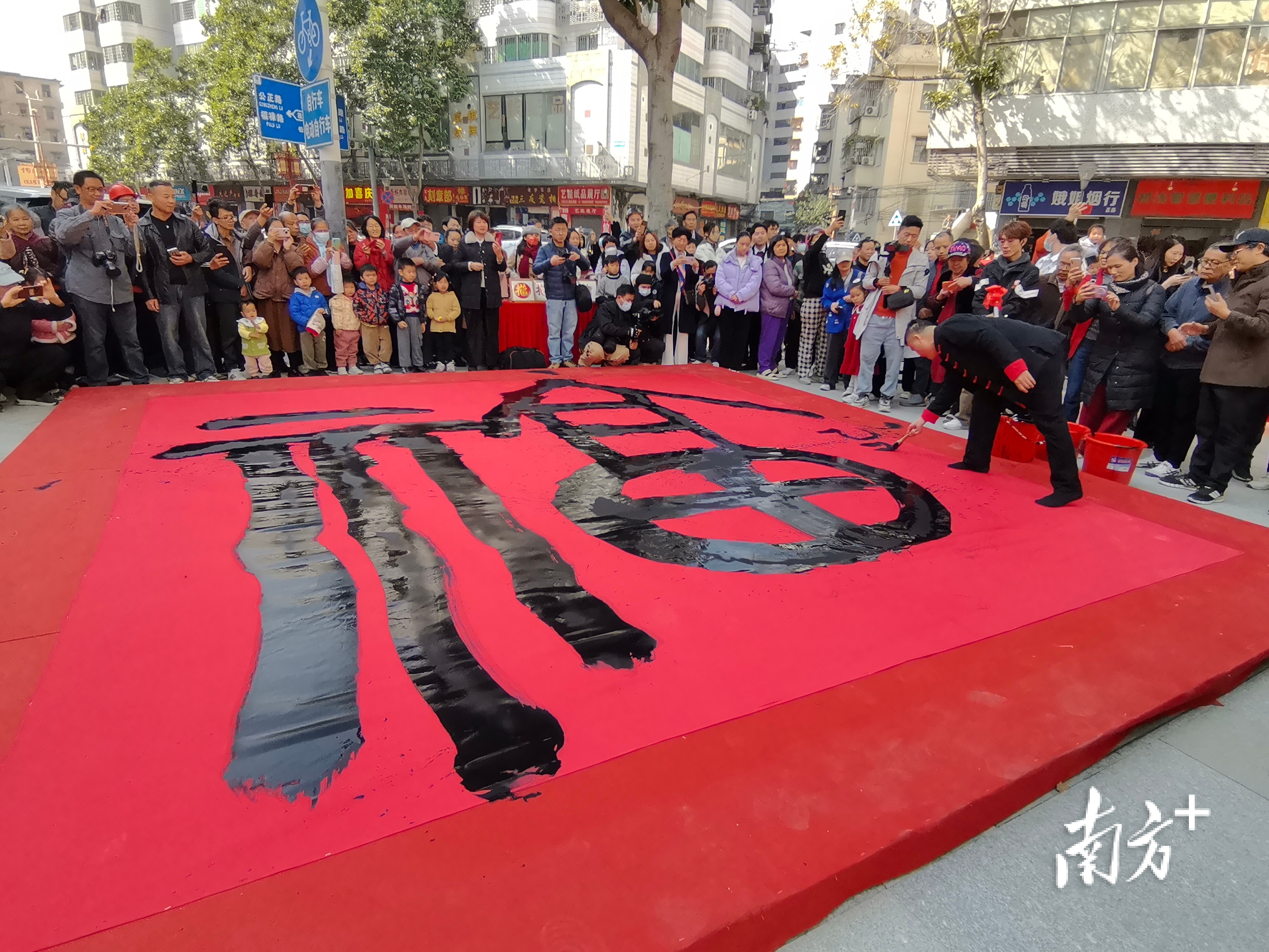 今天的“挥春街迎春纳福”活动中,快子路成为炫技切磋交流书法、拍摄记录感受新春氛围和仪式感的佛山最红的街。看!挥春师傅现场即兴创作篆书体超大“福”字,寓意幸福福气满满,吸引市民群众近距离欣赏并争相记录;锣鼓声中,醒狮、财神爷和佛山古镇IP古仔组成的巡游队伍穿梭街巷,吸引络绎不绝的市民争相领取新年“福气”,醒狮表演的采青环节更是点燃全场热情,人们争先恐后伸手触摸醒狮的头,祈福“好运连连”。
