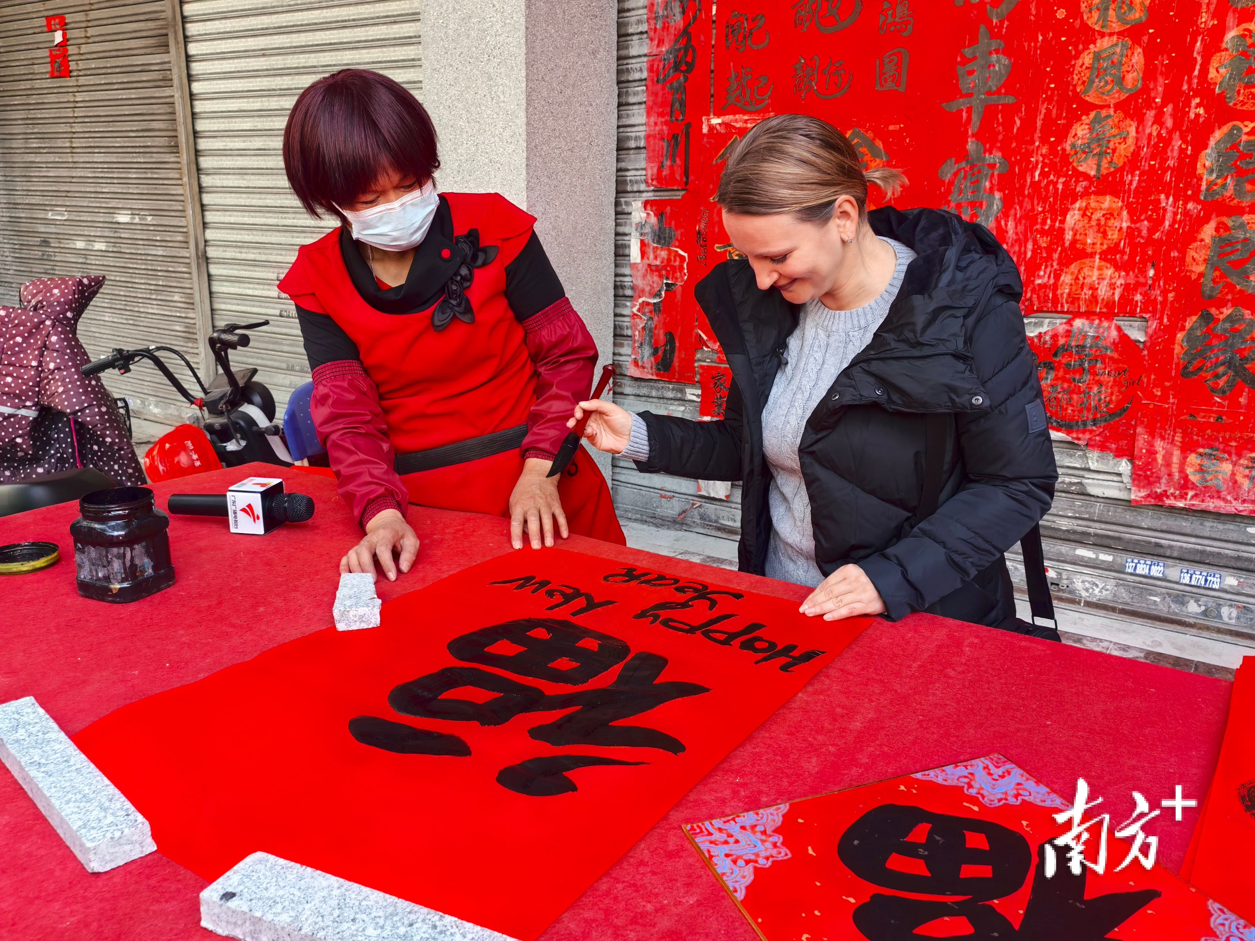 来自塞尔维亚的Anna和尼日利亚的Abdullah也挤在人群中,围观人称“飞姐”的女挥春师傅梁庆飞,写下福字与let Chinese culture go to the world。梁庆飞从小就看爷爷写挥春,后来自己也深深地爱上了写挥春。大约在七八年前,她突发奇想开始将英文融入到中国传统挥春中。一路坚持下来,这些颇具国际范儿的英文挥春特别受欢迎,每年的很多订单都是写好以后直接寄往海外。