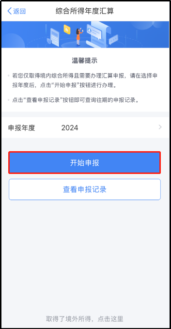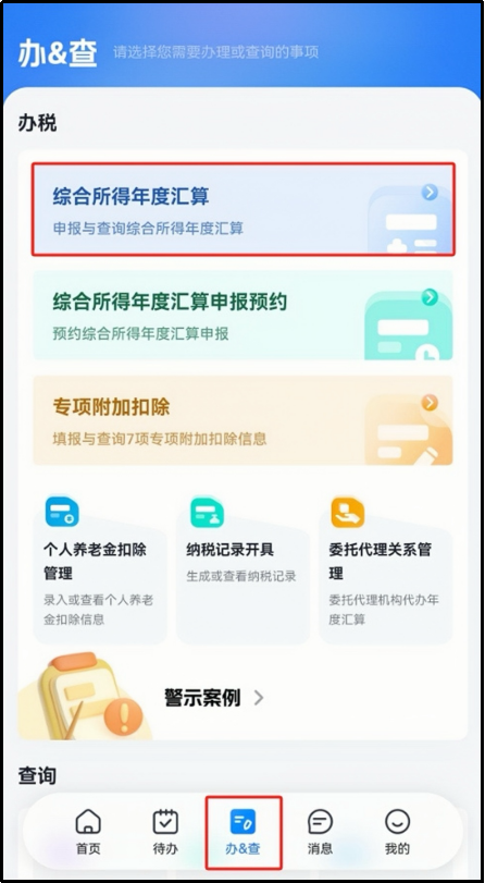 点击【办&查】-【综合所得年度汇算】,点击【开始申报】。