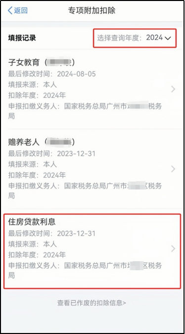 选择查询年度为【2024】,点击【住房贷款利息】专项附加扣除。