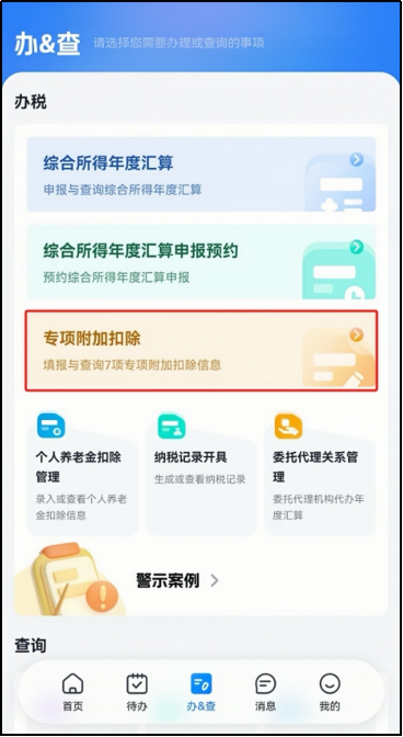 以修改住房贷款利息专项附加扣除的配偶信息为例,点击【办&查】-【专项附加扣除】,