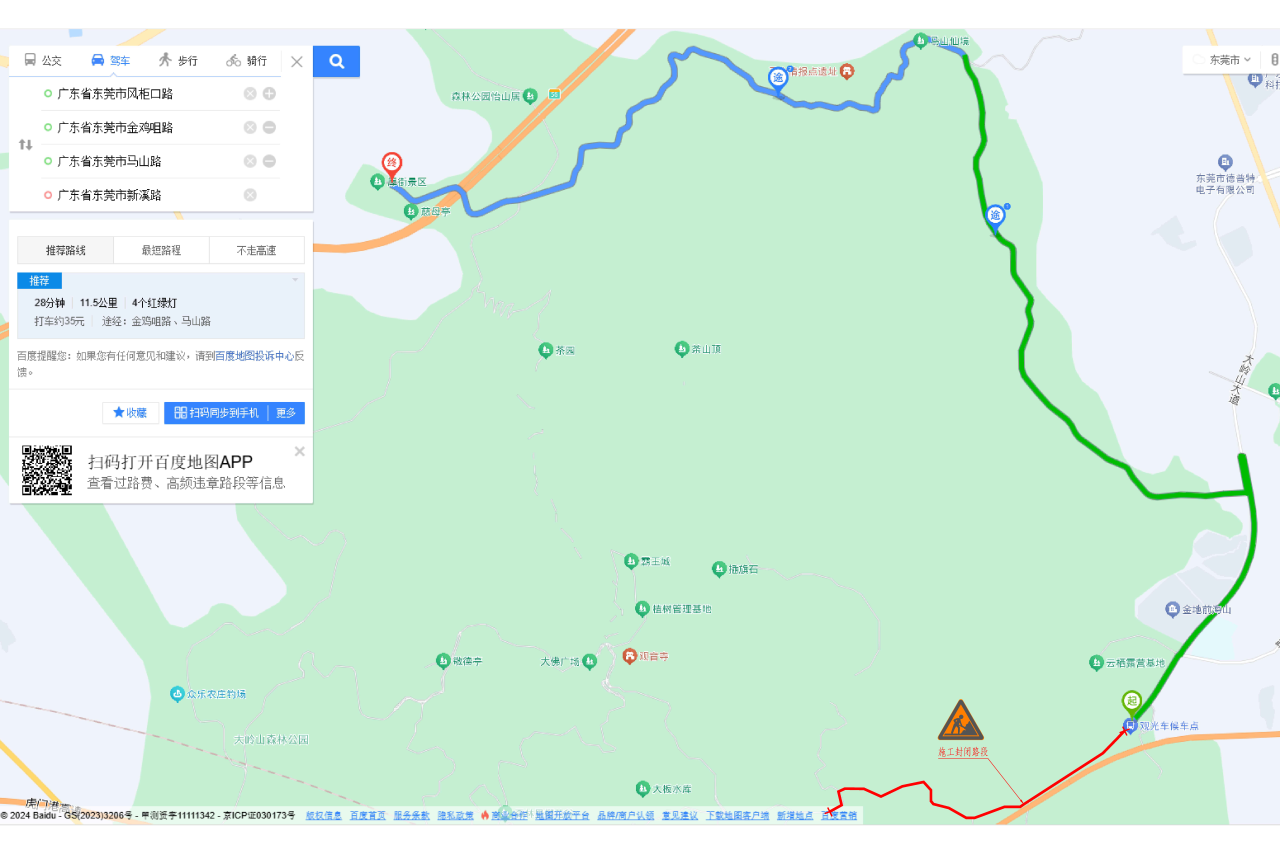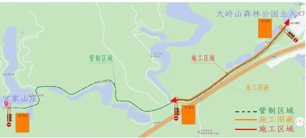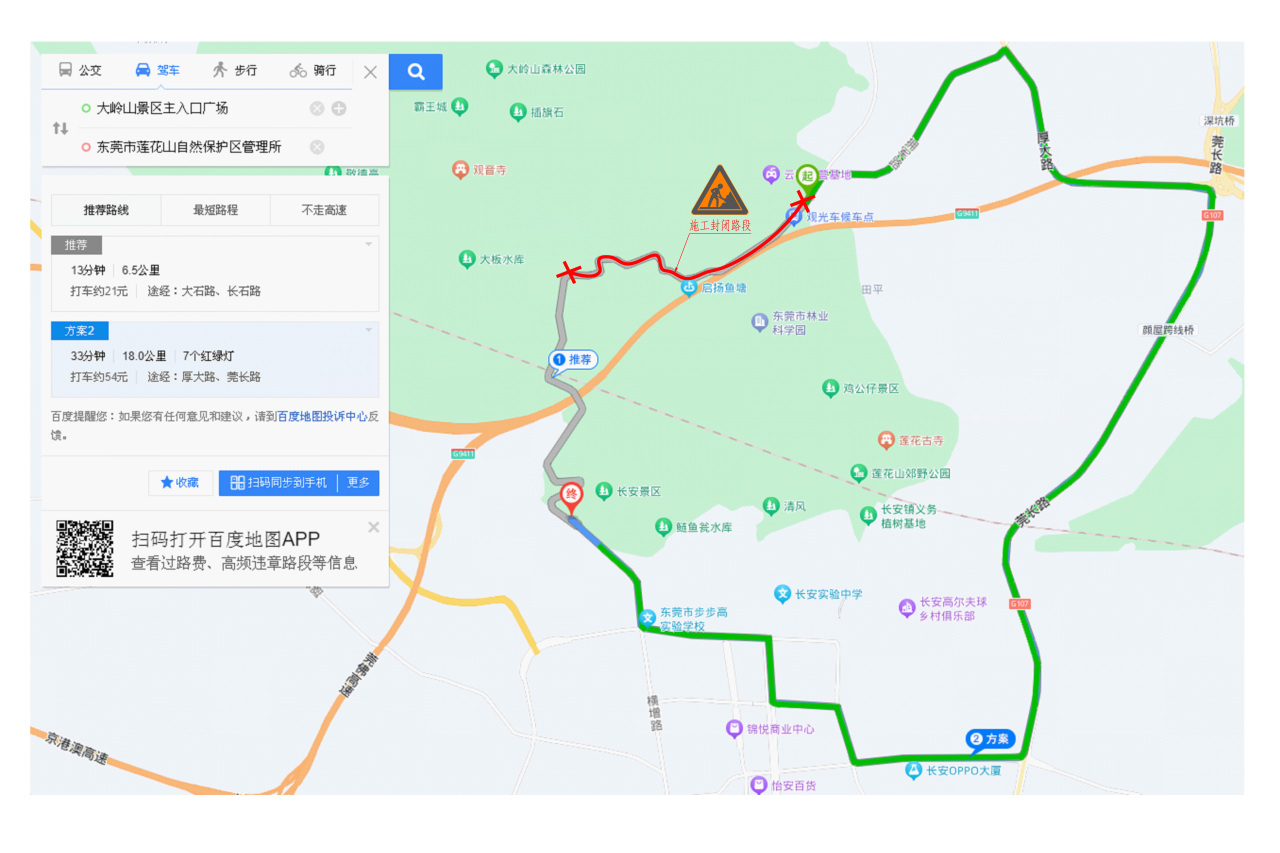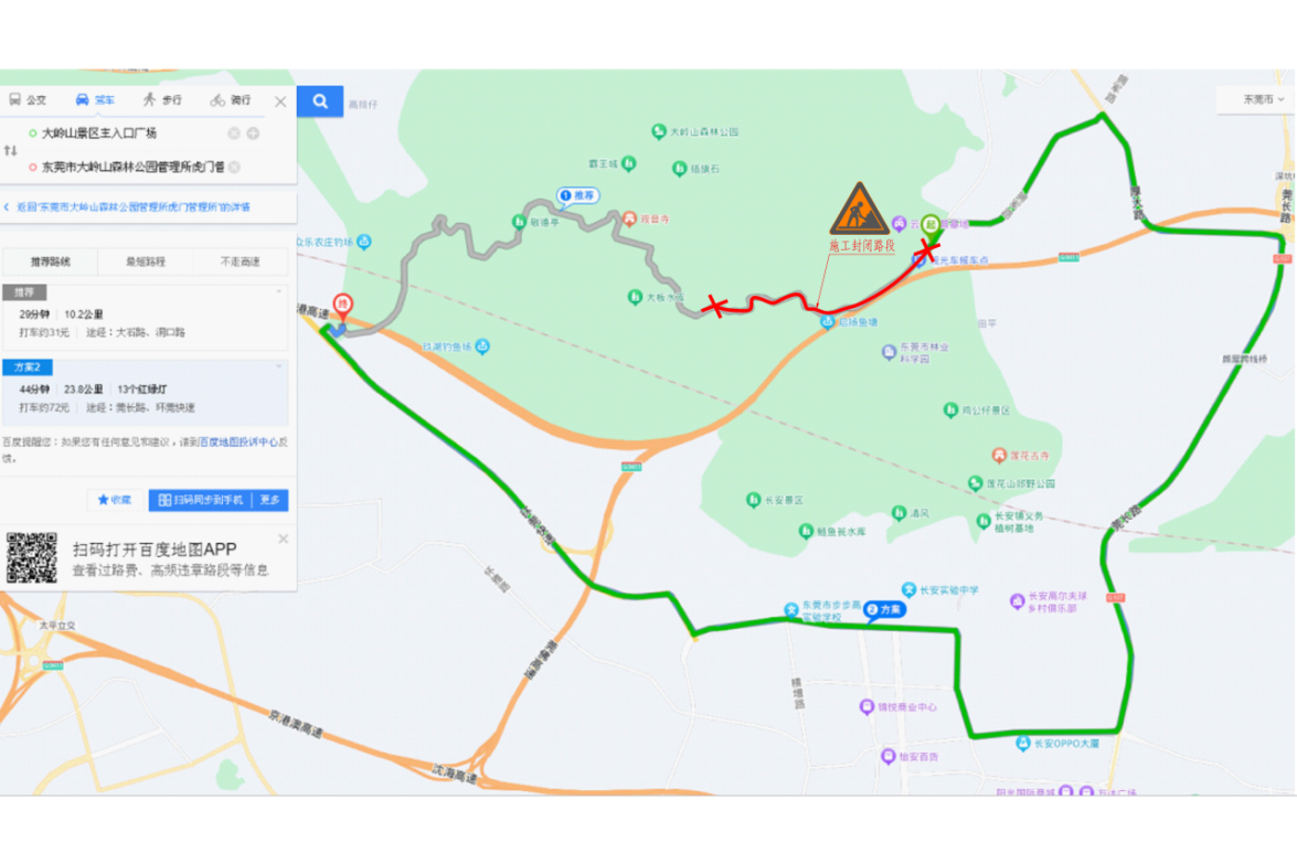 封闭大岭山森林公园大岭山景区主入口后车辆绕行路线二