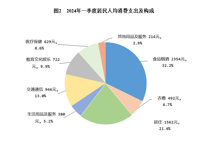 一季度,全国居民人均食品烟酒消费支出2354元,增长10.6%,占人均消费支出的比重为32.2%;人均衣着消费支出492元,增长12.4%,占人均消费支出的比重为6.7%;人均居住消费支出1562元,增长0.1%,占人均消费支出的比重为21.4%;人均生活用品及服务消费支出380元,增长2.9%,占人均消费支出的比重为5.2%;人均交通通信消费支出946元,增长14.8%,占人均消费支出的比重为13.0%;人均教育文化娱乐消费支出722元,增长13.4%,占人均消费支出的比重为9.9%;人均医疗保健消费支出629元,增长3.9%,占人均消费支出的比重为8.6%;人均其他用品及服务消费支出214元,增长21.7%,占人均消费支出的比重为2.9%。