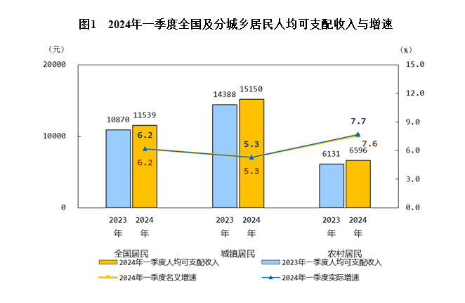 据国家统计局公布,一季度,全国居民人均可支配收入11539元,同比名义增长6.2%,扣除价格因素实际增长6.2%。按常住地分,城镇居民人均可支配收入15150元,同比名义增长5.3%,实际增长5.3%;农村居民人均可支配收入6596元,同比名义增长7.6%,实际增长7.7%。从收入来源看,全国居民人均工资性收入、经营净收入、财产净收入、转移净收入分别名义增长6.8%、6.8%、3.2%、4.8%。全国居民人均可支配收入中位数9462元,同比名义增长6.4%。