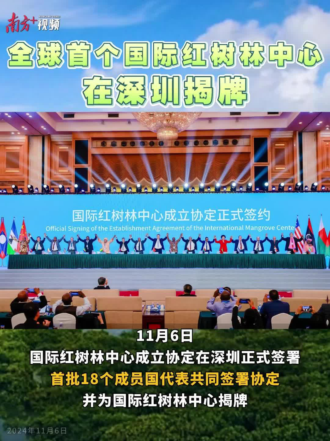 11月6日,国际红树林中心成立协定在深圳正式签署,首批18个成员国代表共同签署协定并为国际红树林中心揭牌。