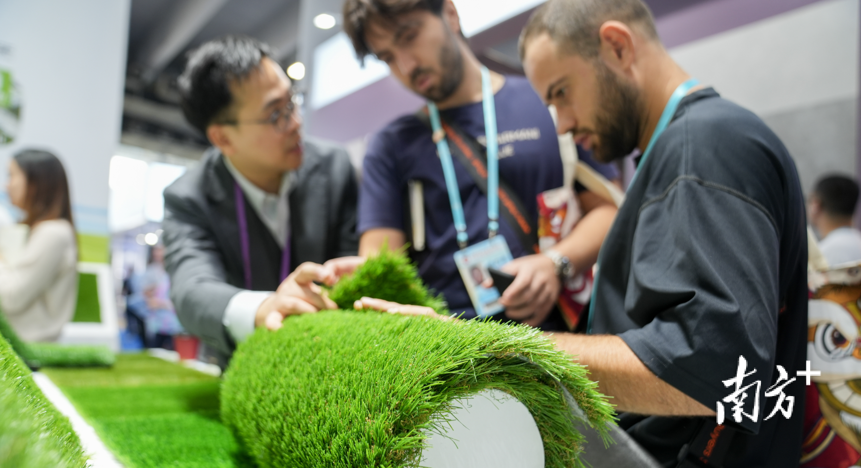 10月23日,广交会第二期第一天,展馆内人潮涌动。外商在了解选购防滑可整体回收人造草坪。