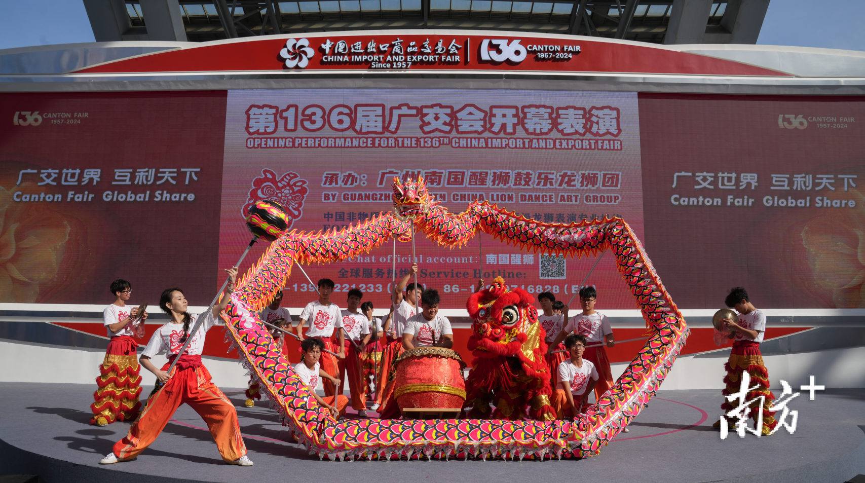 10月23日,现场正在进行舞龙舞狮表演,庆祝广交会第二期顺利开幕。