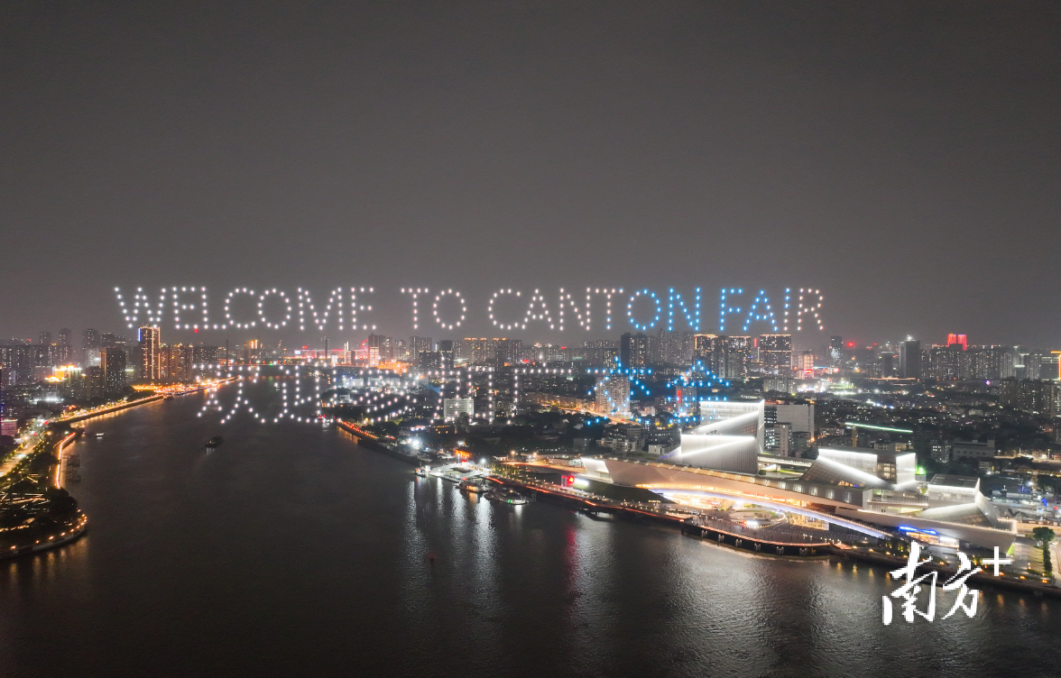 白鹅潭上空,数百架无人机组成“欢迎参加广交会”的图案。