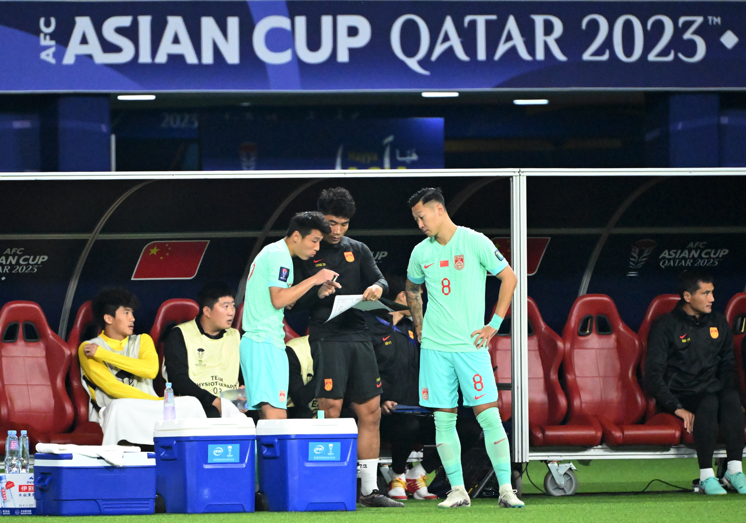 男足亚洲杯小组赛,中国队球员武磊与助理教练员郑智(前中)交流。新华社 发