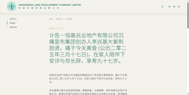 3月17日黄昏,恒基集团创办人李兆基于在家人陪伴下安详与世长辞,享年九十七岁。李兆基1928年出生于广东省顺德市,曾于1996年登上了福布斯全球富豪榜第4位,旗下的香港恒基兆业地产有限公司是香港最有名的地产公司之一,投资股票时的精准眼光更让人称呼他为“香港巴菲特”。详情>>