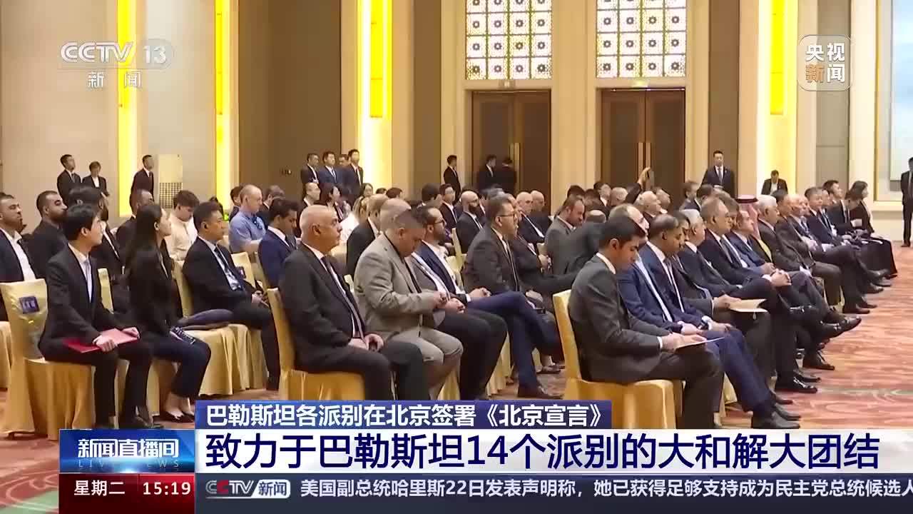 今天上午,中共中央政治局委员、外交部长王毅出席了和解对话闭幕式并致辞,巴各派签署了关于结束分裂、加强巴勒斯坦民族团结的《关于结束分裂加强巴勒斯坦民族团结的北京宣言》,这是巴勒斯坦14个派别首次齐聚北京举行和解对话,为饱受苦难的巴勒斯坦人民带来了宝贵希望。宣言高度赞赏中国为支持巴勒斯坦人民权利、结束分裂、统一巴立场所做的真诚努力,强调应在联合国主持下,召开地区和国际广泛参与的具有充分授权的国际会议,认为北京对话展现了积极和建设性的精神,同意在巴解组织这一巴人民唯一合法代表的框架下,实现涵盖所有派别的民族大团结。