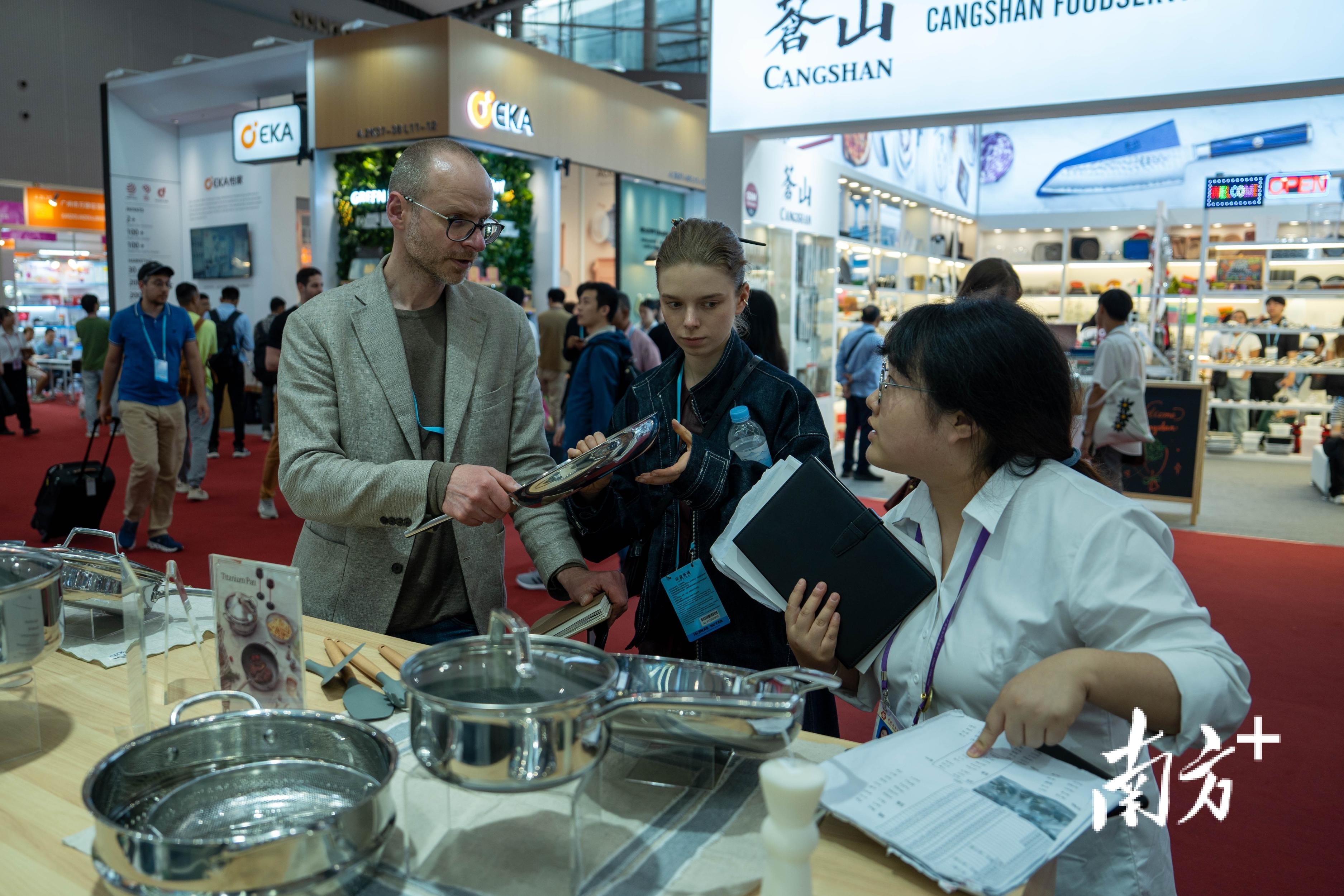 广交会展馆内,参展商向采购商介绍餐厨用品。