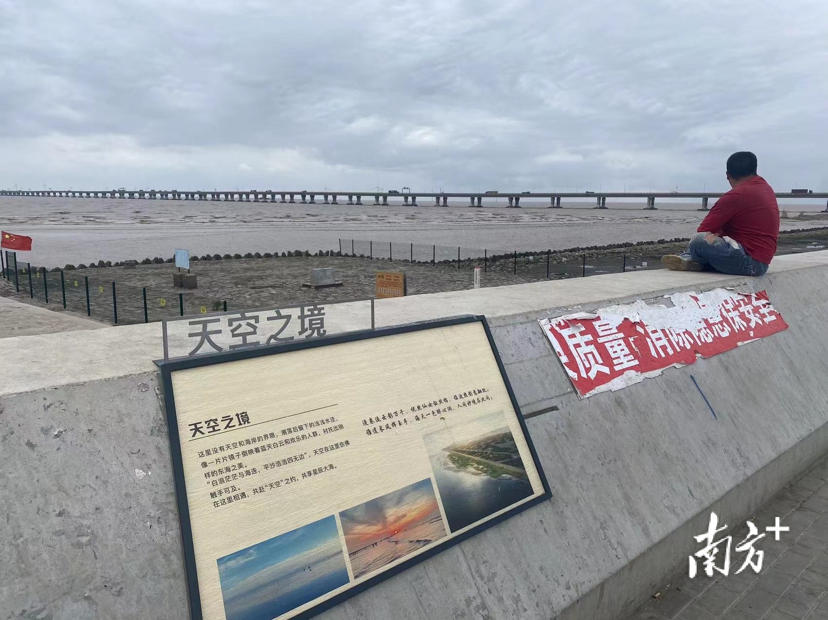 南方+记者在现场看到,由于涨潮,从大堤进入滩涂的通道已被关闭,堤坝上也有提醒游客不要轻易到滩涂玩水的警示牌,但仍有不少游客前来游玩。“看视频这里景色很好,所以就过来看看。”一名游客告诉记者,现在看起来风浪比较大,如果不熟悉环境,贸然到水边还是很危险。