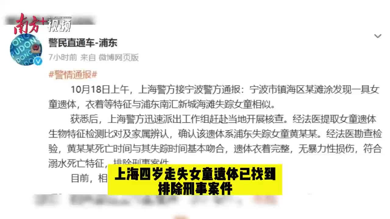 10月18日上午,上海警方接宁波警方通报:宁波市镇海区某滩涂发现一具女童遗体,衣着等特征与浦东南汇新城海滩失踪女童相似。