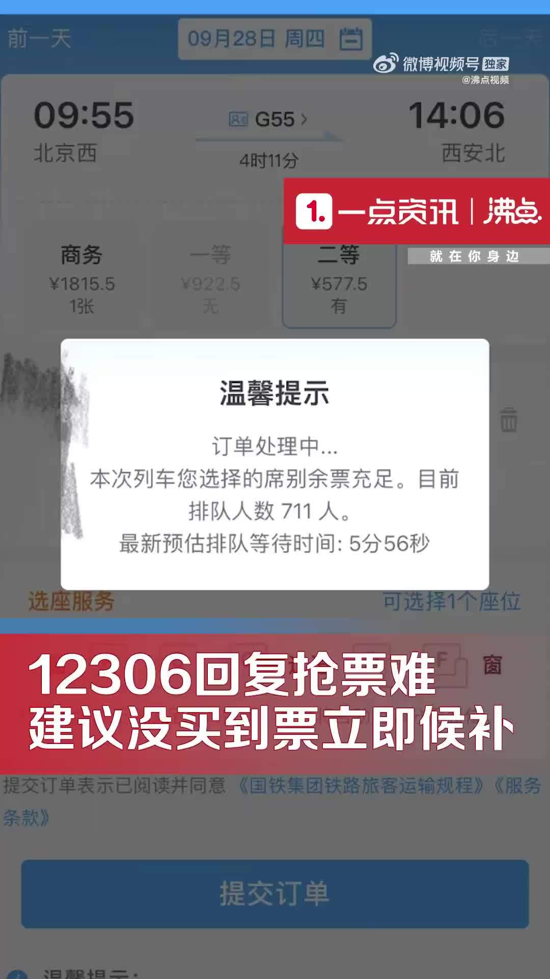 12306客服称今年中秋国庆比往年更难抢票:建议用户立即候补