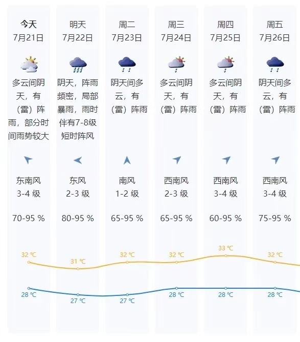21-22日多间歇性(雷)阵雨,部分时间雨势较大,局地有暴雨风险,雨时伴有7-8级最大阵风,其中21日气温28-32℃;