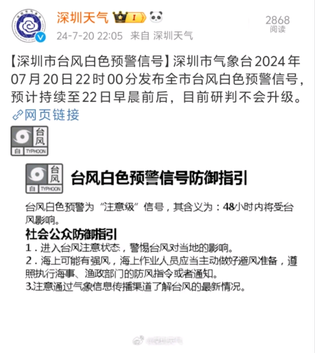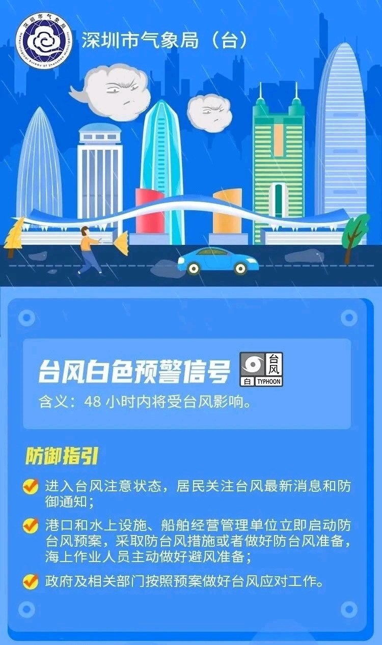 深圳市气象台2024年07月20日22时00分发布全市台风白色预警信号,预计持续至22日早晨前后,目前研判不会升级。