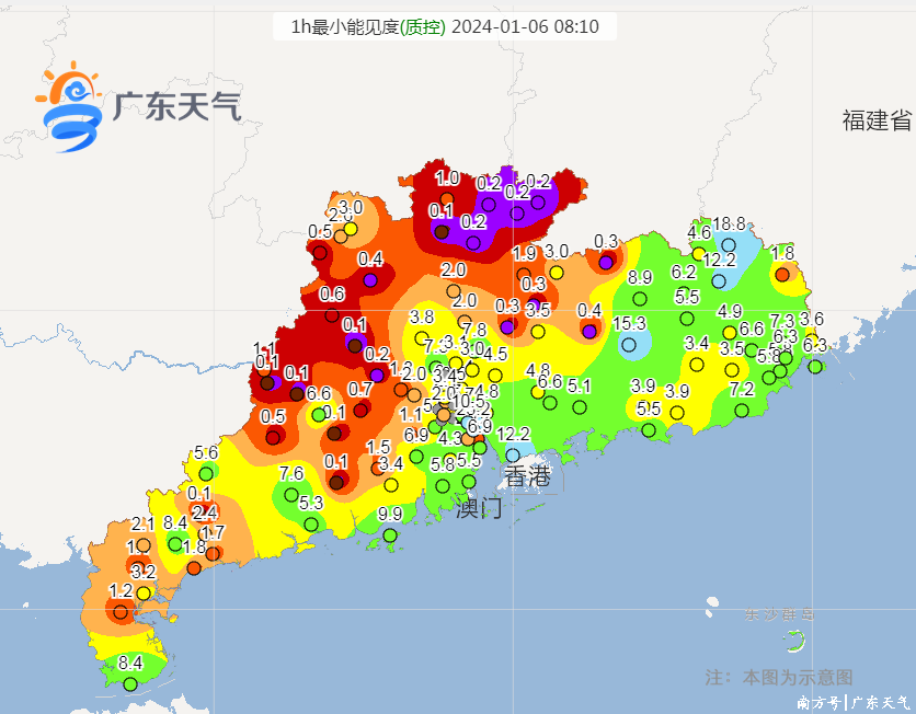 5日夜间到6日早晨,肇庆北部、清远北部和韶关中北部市县出现了小雨,粤北、珠三角西部和粤西的部分市县出现了能见度小于1公里的大雾,早晨大部最低气温较5日继续小幅上升。