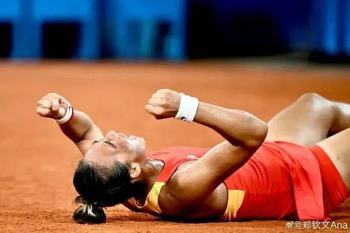 郑钦文赢下半决赛后倒地庆祝,图源:微博@郑钦文Ana