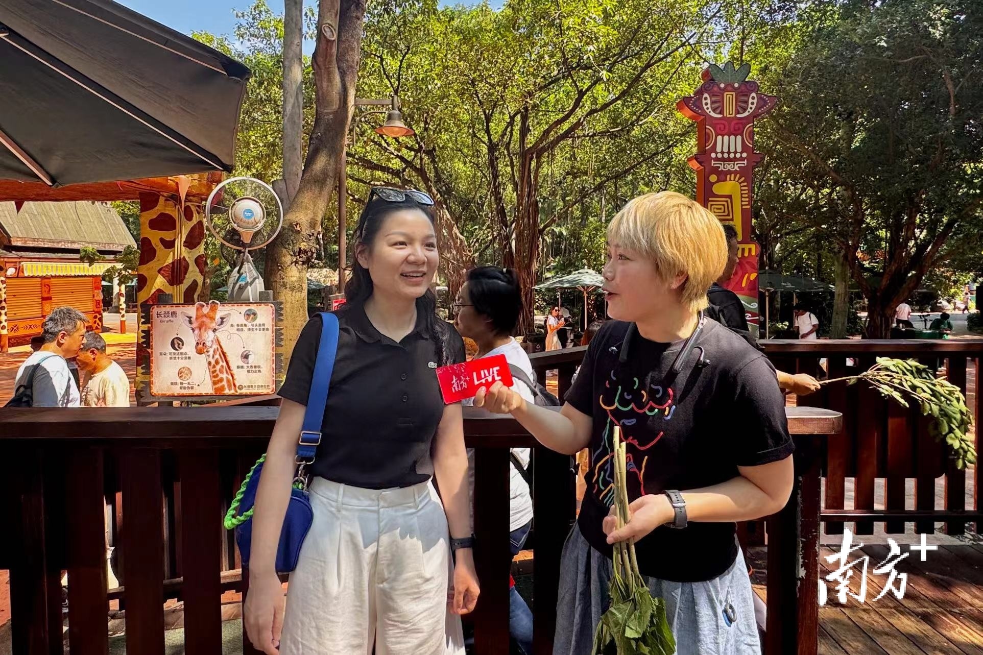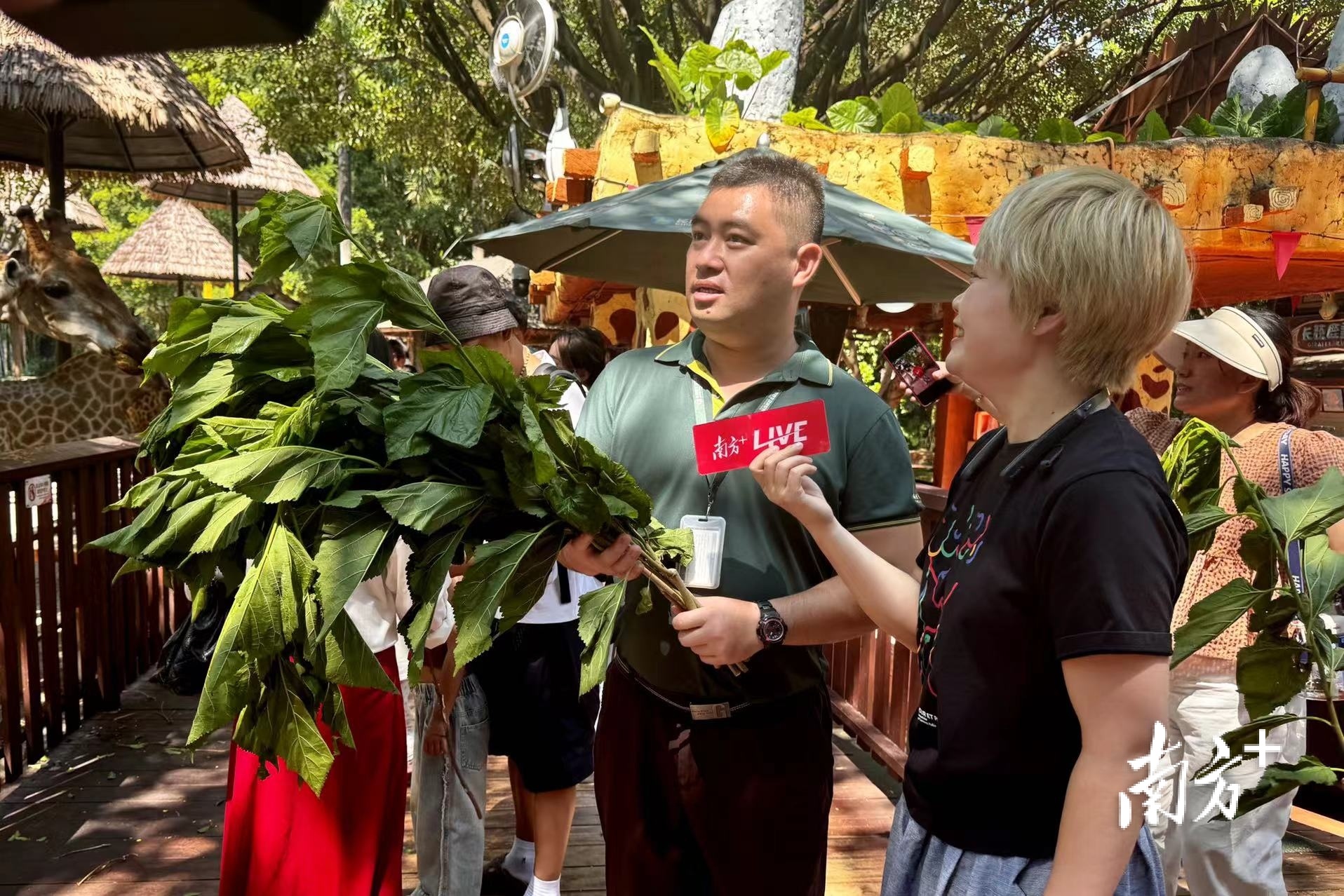 一位来自广州本地的游客,正抱着2岁多的小朋友,举着桑树枝喂长颈鹿。他说,孩子喜欢互动类体验,他们今天参与了喂老虎、喂长颈鹿等,每一次他都会向小朋友介绍动物习性,而平日里也会带小朋友去一些科普馆,拓宽孩子的视野。