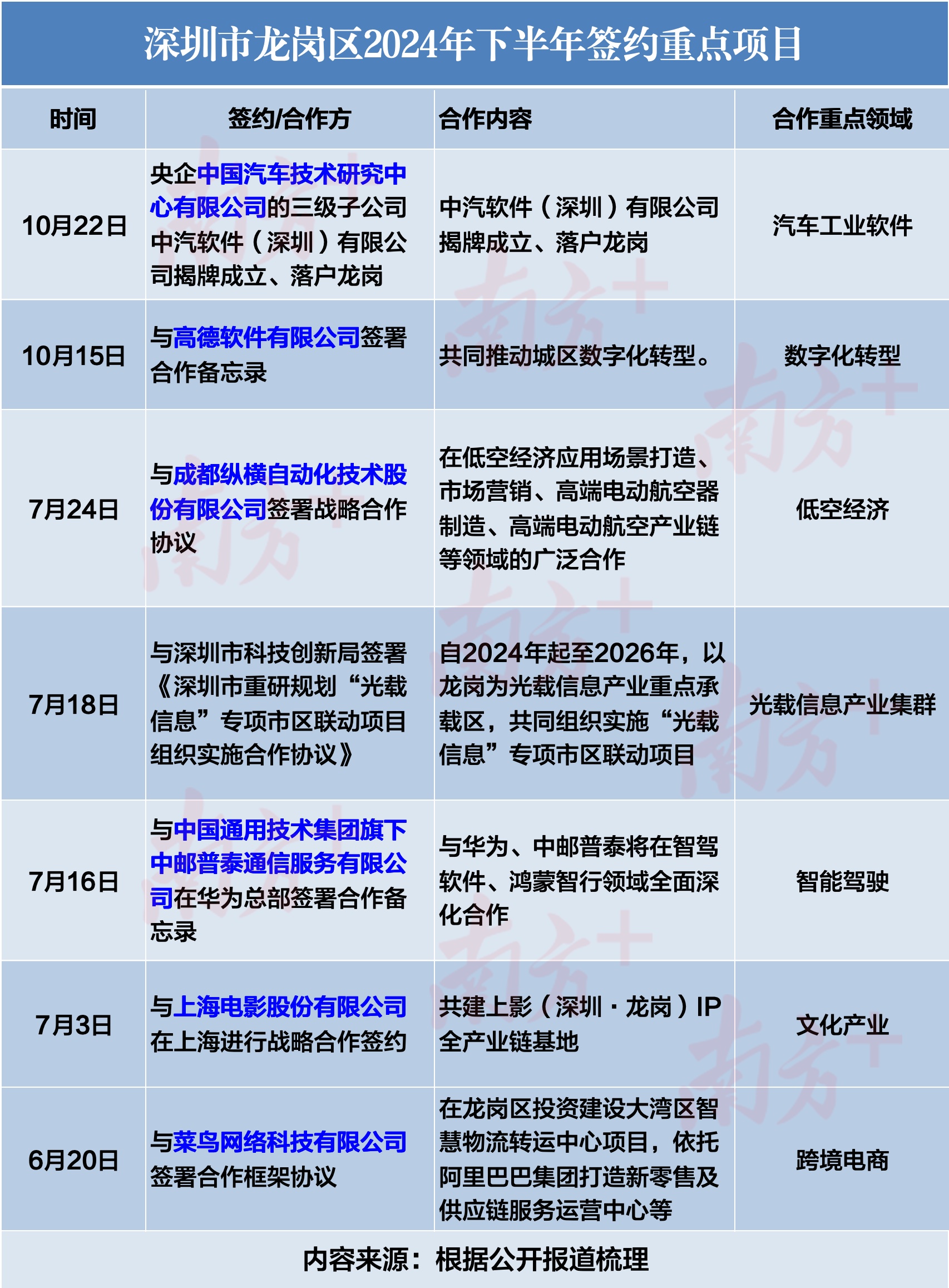 今年下半年以来,龙岗区已“牵手”多家行业龙头企业,加码布局低空经济、光载信息、智能驾驶、汽车工业等深圳重点发展的“20+8”产业,成功招引一批技术含量高、附加值高、市场前景好、辐射带动力强的重点项目。