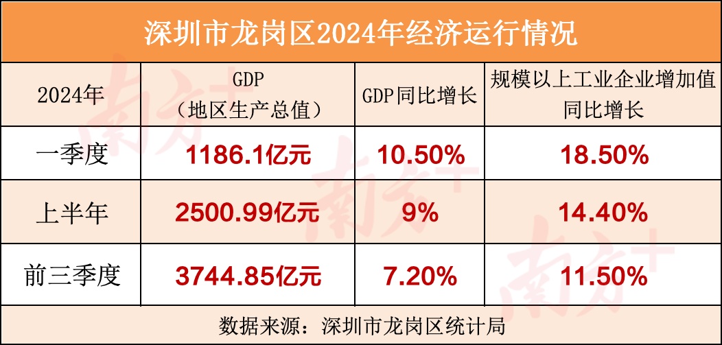 10月底,深圳市龙岗区统计局公布2024年前三季度经济运行情况:龙岗区实现地区生产总值为3744.85亿元,同比增长7.2%,全区规模以上工业企业增加值同比增长11.5%。