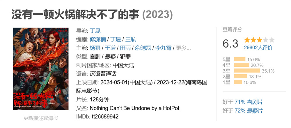 《没有一顿火锅解决不了的事》是由丁晟执导,修潇楠、丁晟、王航编剧,杨幂、于谦、田雨、余皑磊、李九霄主演的悬疑喜剧电影,影片于5月1日正式公映。