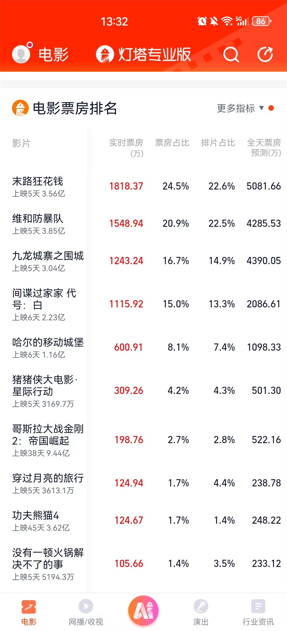 5月5日的单日票房和排片。数据来源:灯塔专业版