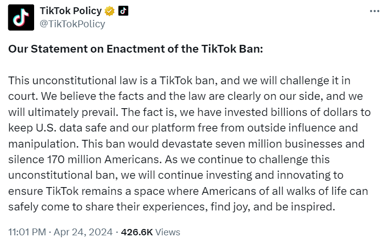 TikTok发布声明,直接将该法案称为“禁令”,并称公司将在法庭上对其发起挑战:“相信事实和法律显然站在我们这一边,我们最终会获胜。事实就是,我们已经投入了数十亿美元来保证美国用户的信息安全,让平台免受外界影响和操控。该禁令将会摧毁700万家企业,让1.7亿美国人失去声音。”