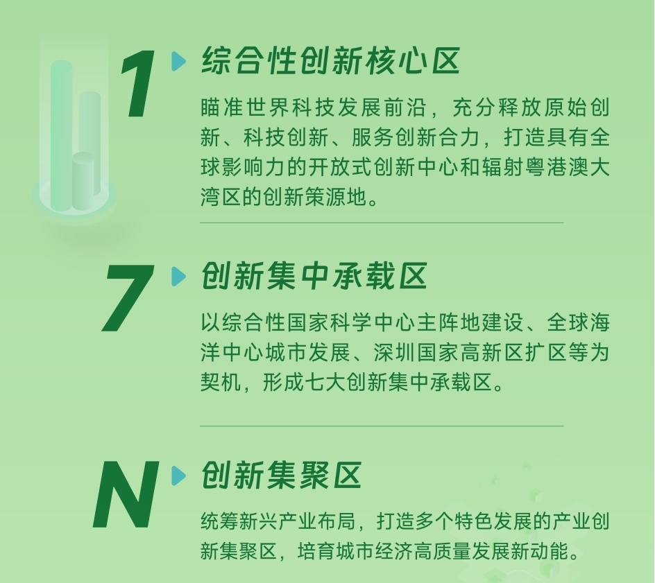 “7”即创新集中承载区,以综合性国家科学中心主阵地建设、全球海洋中心城市发展、深圳国家高新区扩区等为契机,形成七大创新集中承载区。