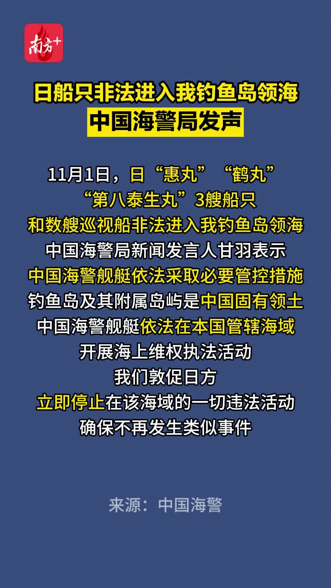 中国海警局新闻发言人甘羽表示,11月1日,日“惠丸”“鹤丸”“第八泰生丸”3艘船只和数艘巡视船非法进入我钓鱼岛领海,中国海警舰艇依法采取必要管控措施。钓鱼岛及其附属岛屿是中国固有领土,中国海警舰艇依法在本国管辖海域开展海上维权执法活动。我们敦促日方立即停止在该海域的一切违法活动,确保不再发生类似事件。