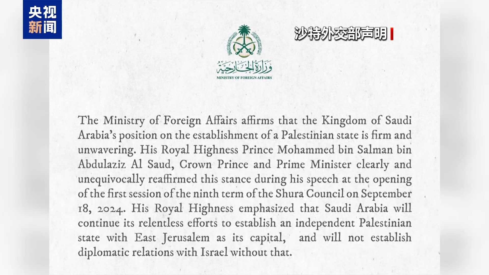 沙特外交部:除非建立巴勒斯坦国 否则不会与以建交