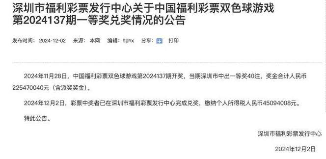 11月28日,中国福利彩票双色球游戏第2024137期开奖,当期深圳市中出一等奖40注,奖金合计人民币225470040元(含派奖奖金)。12月2日,彩票中奖者已在深圳市福利彩票发行中心完成兑奖,缴纳个人所得税人民币45094008元。
