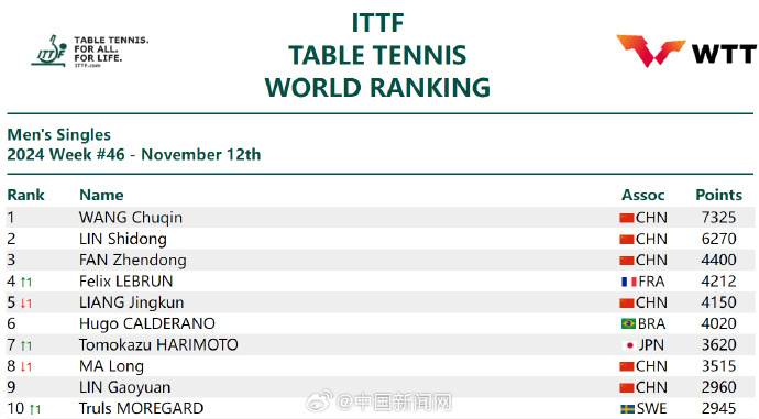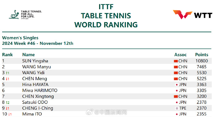 11月12日,2024国际乒联第46周排名公布,男单方面,王楚钦第1、林诗栋第2、樊振东第3,女单方面,孙颖莎第1、王曼昱第2、王艺迪第3。
