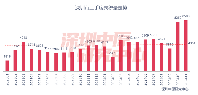 据深圳中原研究中心统计,11月,深圳二手房录得量达到8500套,环比上涨2.8%,为近46个月来最高。