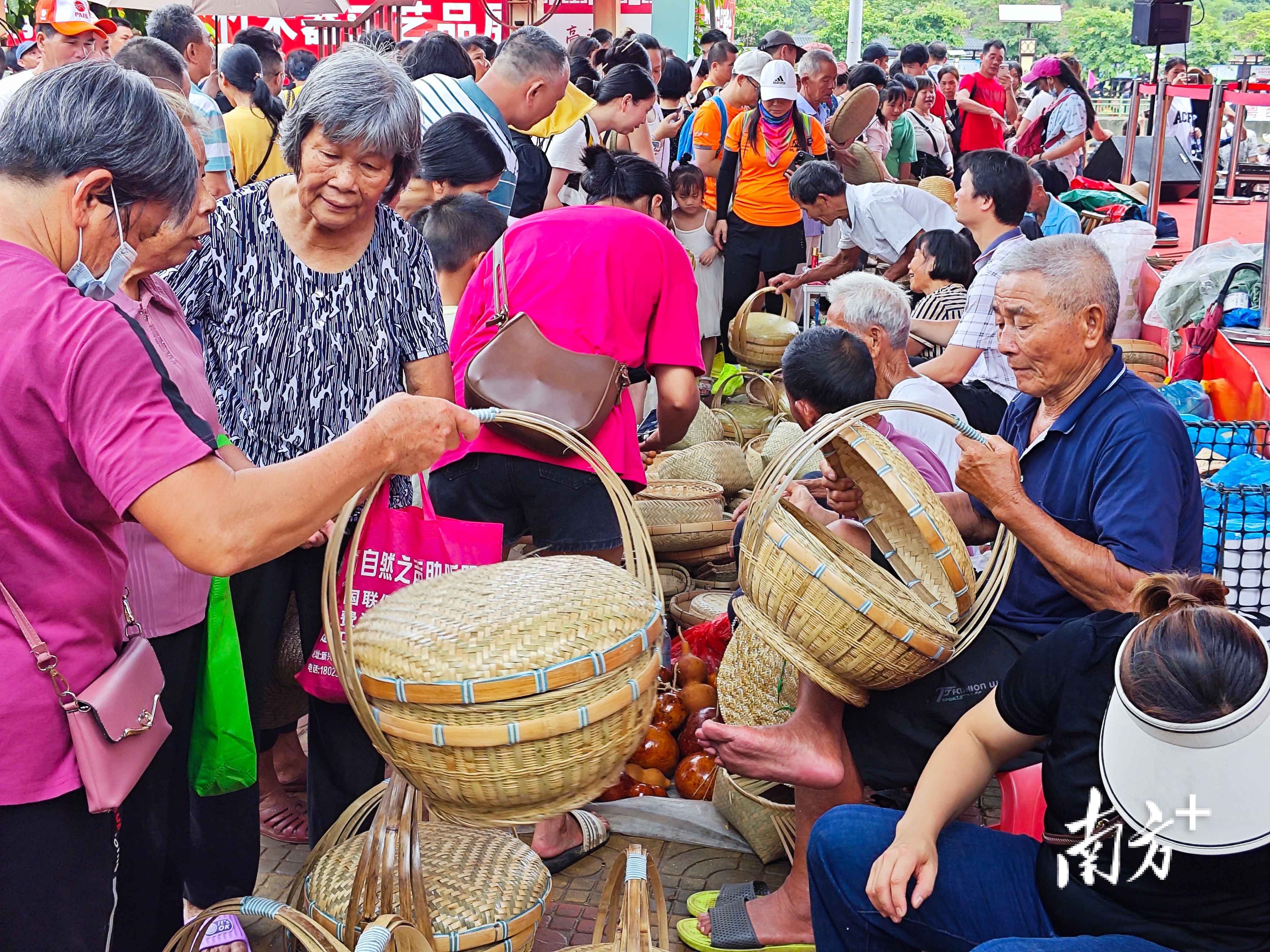 活动现场,各式各样的竹木藤器是最引人注目的亮点。高流河畔不仅汇集了民间手工艺者自编的箩筐、竹筛、菜篮、竹椅、扁担、梯子等各式各样的竹木器,还吸引了来自阳春本地竹木器企业(作坊)和罗定、肇庆等地的近50家商户踊跃参展,各类竹木器产品令人眼花缭乱,许多游客竞相选购,身上扛满了“战利品”。