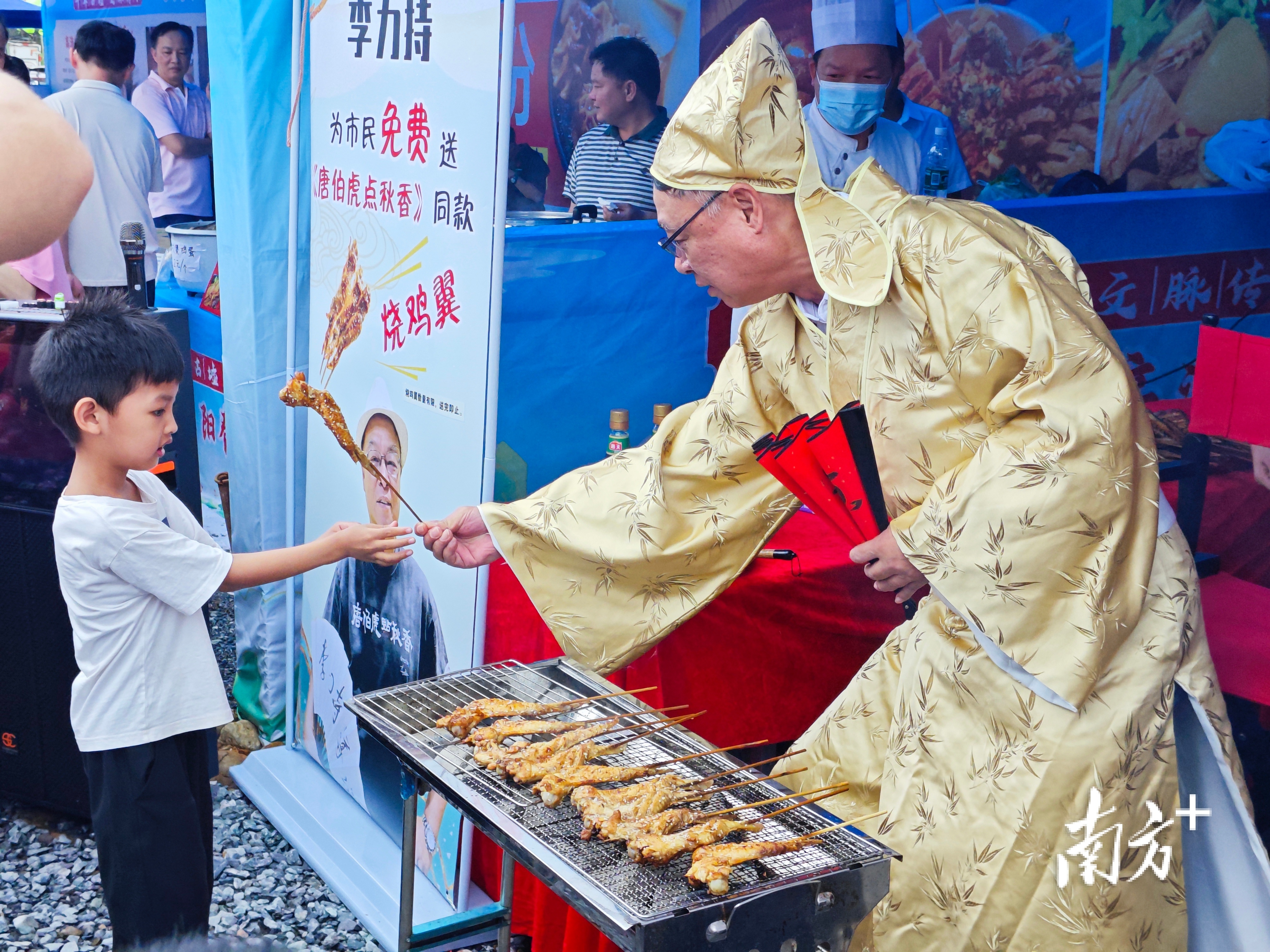 “烧鸡翼,中意吃……”高流河墟活动当天,曾执导《喜剧之王》《唐伯虎点秋香》《国产凌凌漆》等多部香港经典电影的导演李力持也来到现场为活动“打Call”,他还扮成电影《唐伯虎点秋香》中唐伯虎的造型,为广大游客赠送小吃“烧鸡翅”,吸引了许多游客排队参与。