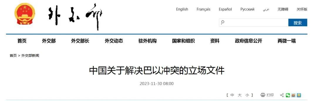 11月30日,外交部网站发布中国关于解决巴以冲突的立场文件:
