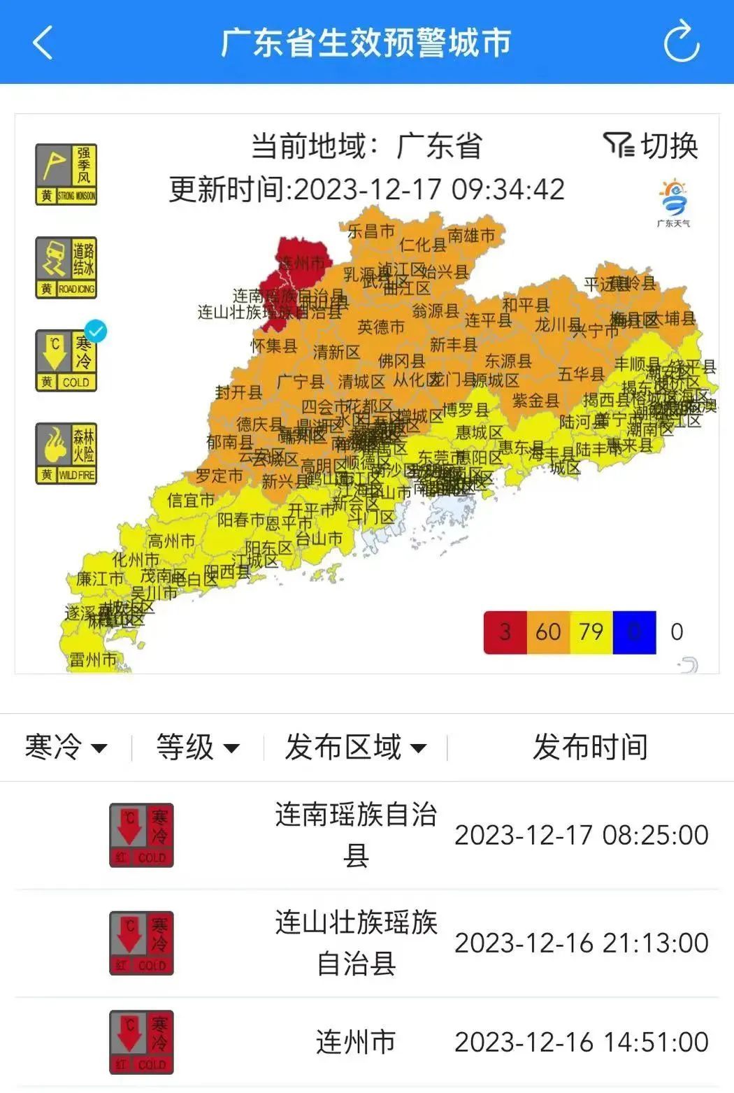79个寒冷黄色预警信号
