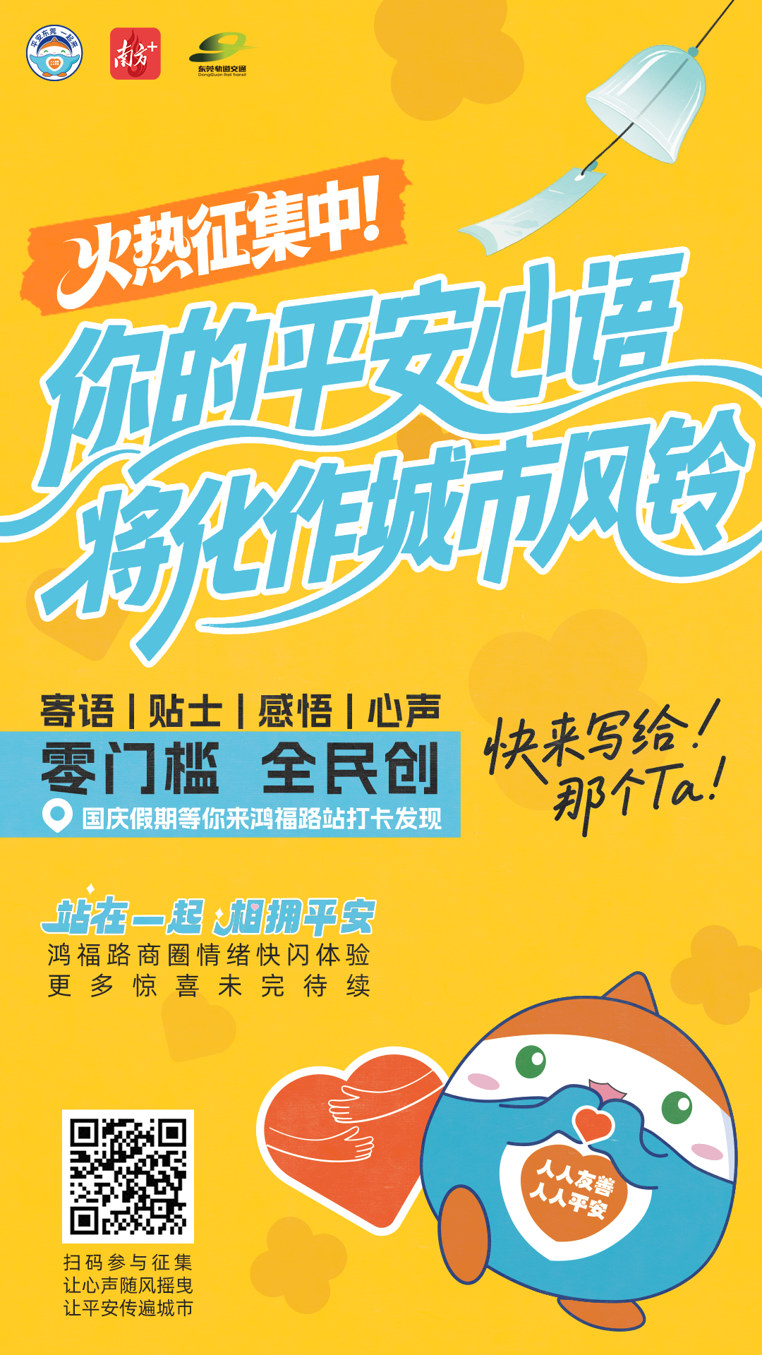 在国庆中秋假期来临之际,东莞市委平安办联合南方报业传媒集团、东莞市轨道交通有限公司等单位,即将发起“站在一起,相拥平安”鸿福路商圈情绪快闪体验。我们邀请市民朋友们一起发现和分享生活中那些微小的安全感,可以是写给特定的人,也可以写给自己,写给这座城市;可以是被看见、被理解、被托住的瞬间,也可以是从相互守护中获得的安心与踏实。