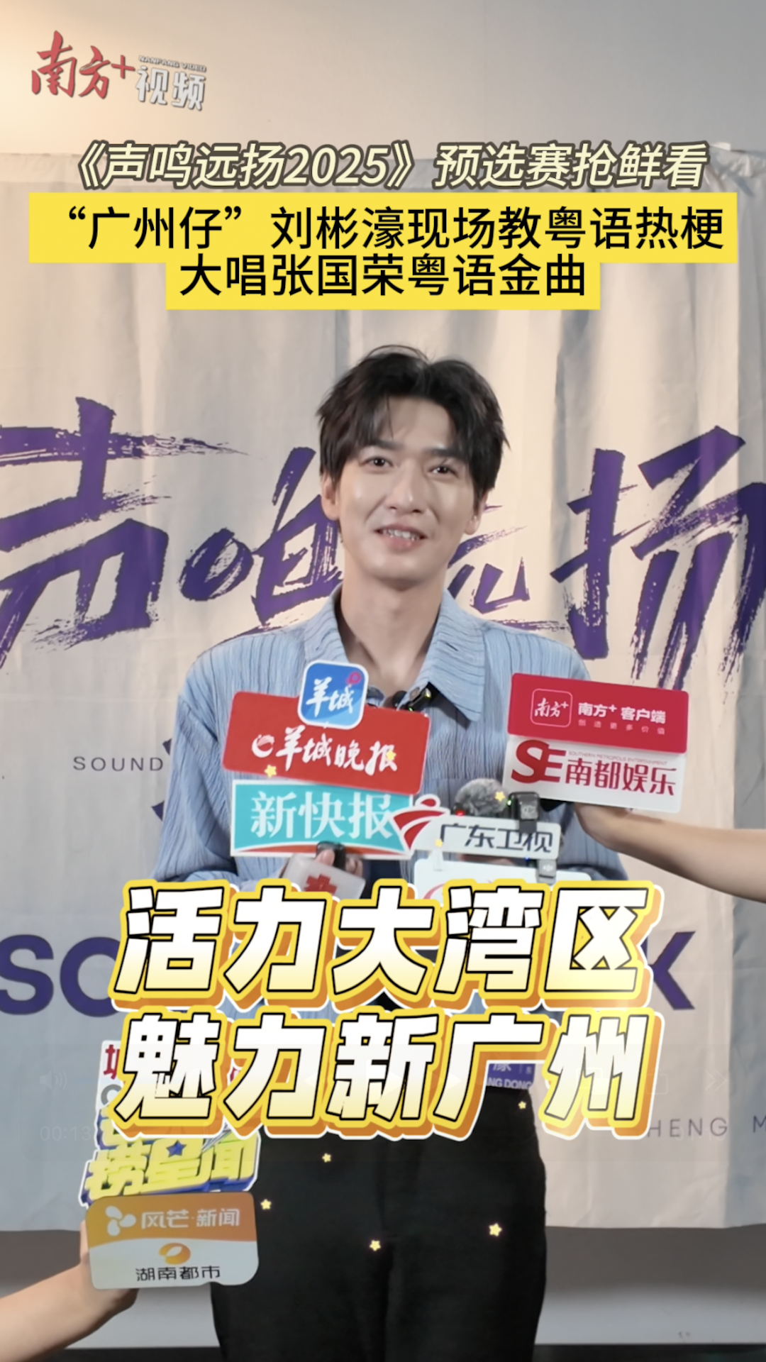 在广州土生土长、毕业于星海音乐学院声乐歌剧系的刘彬濠现场接受媒体采访时提到,在《声鸣远扬2025》广东卫视赛区预选赛的舞台上能遇见《声入人心第一季》的出品人尚雯婕以及和自己曾同台“作战”的“龙哥”郑云龙,他觉得非常开心。被问及因为选手身份而觉得和担任评审的郑云龙同台产生落差时,刘彬濠表示没有什么落差:“因为龙哥一直是我在职业生涯道路上的榜样,一直是我的好大哥,他平时也会给我很多意见和建议。”他还提到,自己本来准备在舞台上教三位评审和现场观众粤语热梗:“想教老师们说我们最近很火的宣传标语‘活力大湾区,魅力新广州’,可惜没有找到那个话口。”一直坚持粤语音乐创作的刘彬濠也表示,如果能够进入之后的赛程,他希望能在节目中演唱“哥哥”张国荣的粤语金曲《明星》,并“慷慨”地现场清唱了一小段。