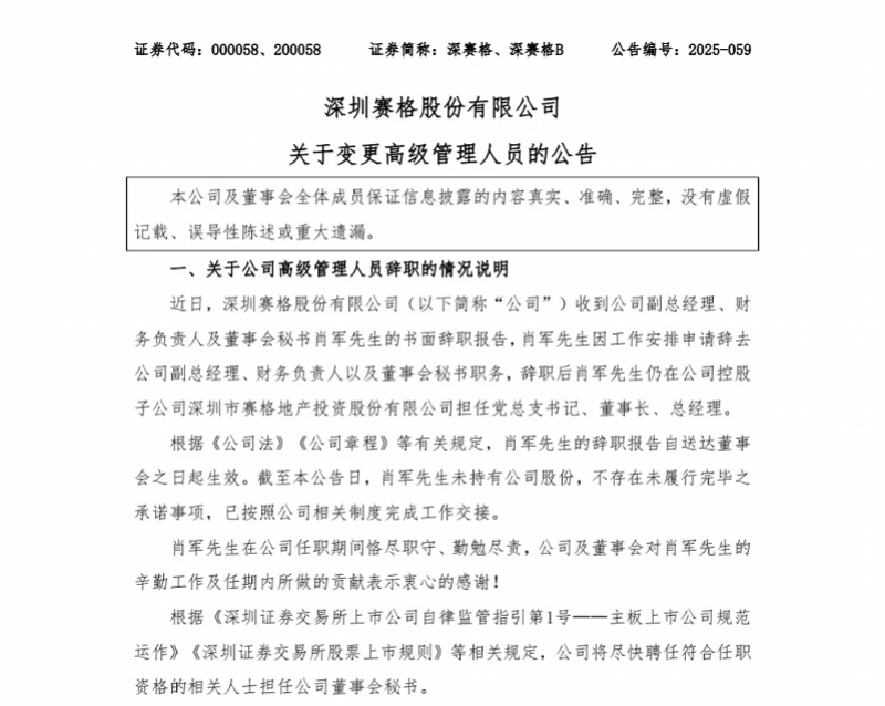 9月23日,深圳国资系上市公司深赛格(000058.SZ)发布公告,公司副总经理、财务负责人兼董事会秘书肖军因内部工作调整辞去三项核心职务,辞职后将专职担任控股子公司深圳市赛格地产投资股份有限公司党总支书记、董事长、总经理。