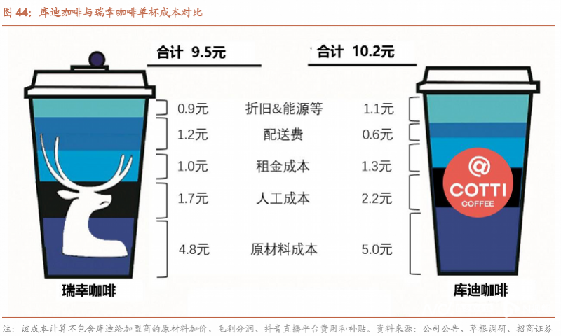 招商证券发布的咖啡行业深度报告,推算了库迪和瑞幸的单杯成本,按照单杯9.9元的价格、瑞幸咖啡单店500 杯、库迪咖啡 300-400杯的模型测算,瑞幸的单杯成本约为9.5元,库迪约为10.2元。如果算上品牌自己的补贴以及渠道优惠手段,库迪在店均杯量是240-320杯的情况下,实际的单杯成本可能超过了11元。不过,2023年5月,库迪咖啡的首席策略官李颖波公开表示,库迪一杯咖啡的成本不会超过9块钱。