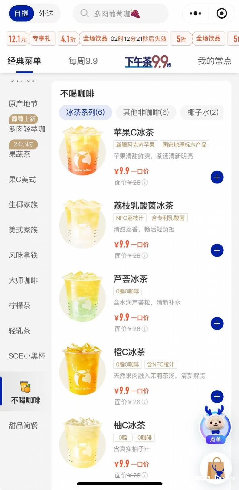 以有财报数据的瑞幸为例,南都记者打开其小程序发现,“9.9元”的产品除了咖啡还包含果蔬茶、冰茶、柠檬水等,后者的原材料成本与咖啡有差异。同时,南都记者不完全统计,瑞幸9.9元以上的产品超过60款,而这些饮品也会吸引相当数量的消费者下单,其单杯利润肯定高于9.9元的单杯咖啡。